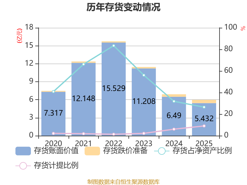 从存货变动来看,截至2025年末,公司存货账面价值为5.43亿元,占净资产的26.45%,较上年末减少1.06亿元。其中,存货跌价准备为5383.6万元,计提比例为9.02%。