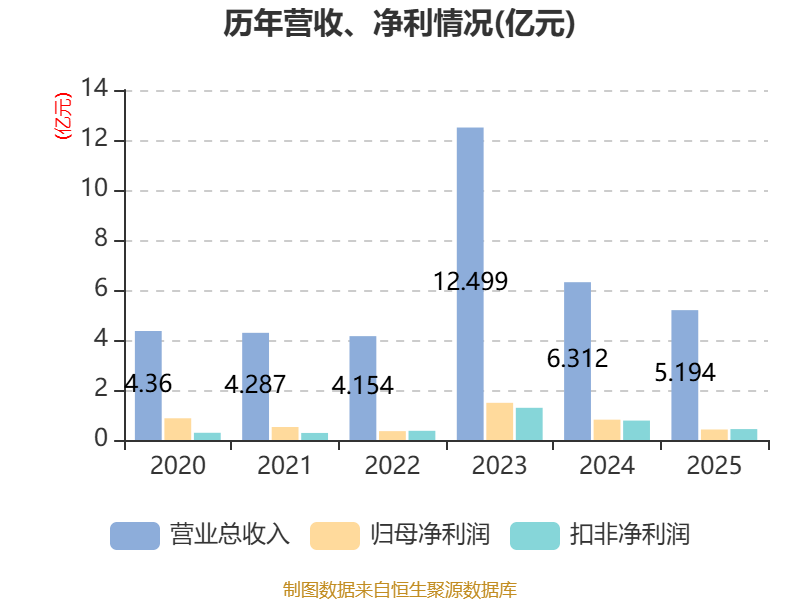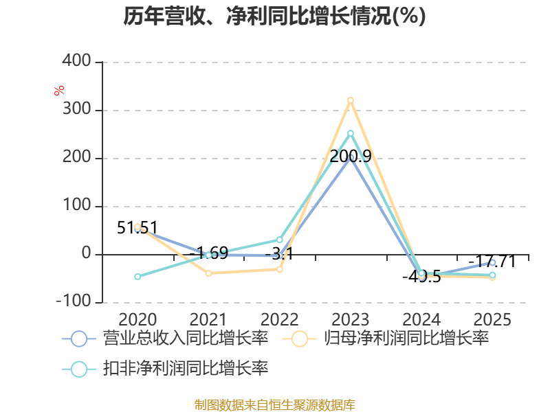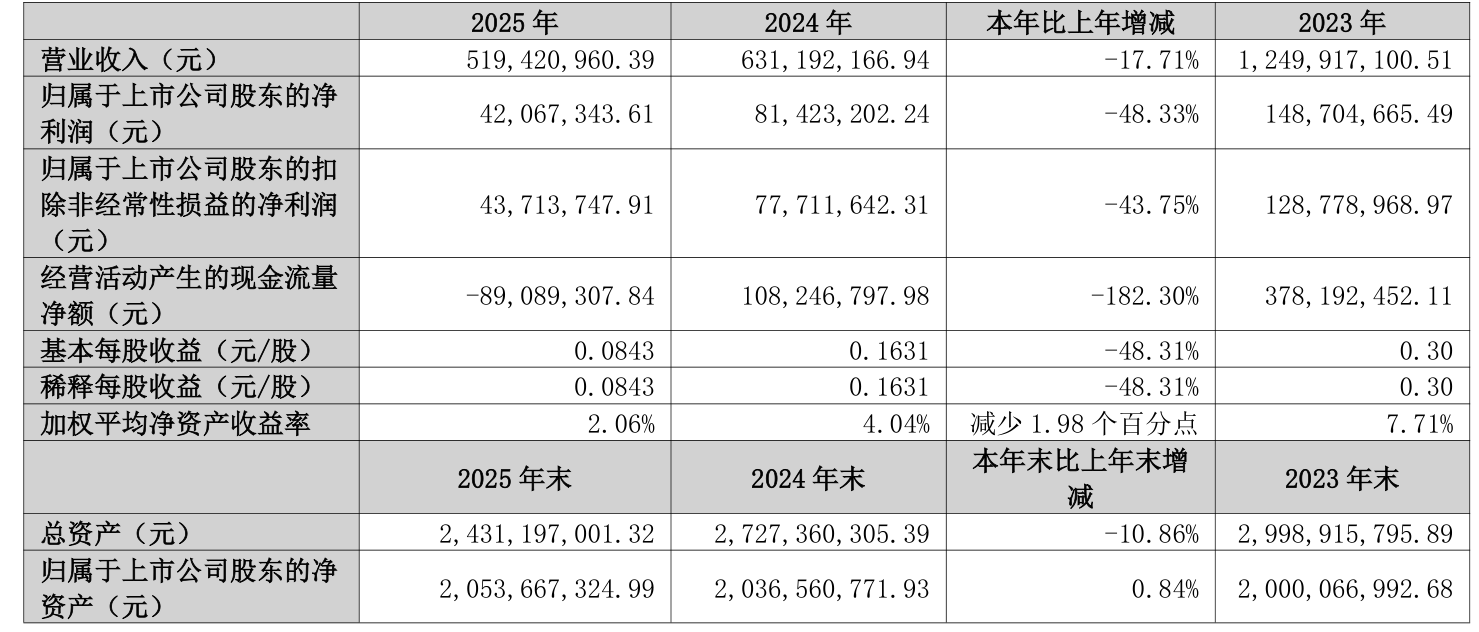 中证智能财讯湖南投资(000548)4月4日披露2025年年度报告。2025年,公司实现营业总收入5.19亿元,同比下降17.71%;归母净利润4206.73万元,同比下降48.33%;扣非净利润4371.37万元,同比下降43.75%;经营活动产生的现金流量净额为-8908.93万元,上年同期为1.08亿元;报告期内,湖南投资基本每股收益为0.0843元,加权平均净资产收益率为2.06%。公司2025年度分配预案为:拟向全体股东每10股派现0.3元(含税)。