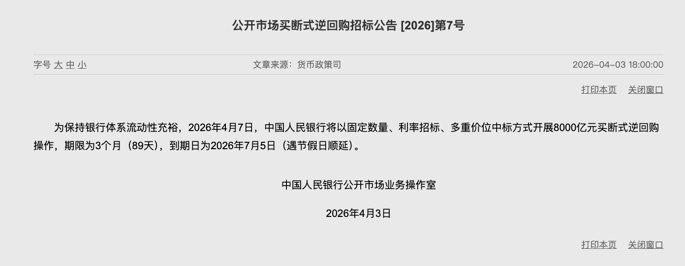 4月3日,中国人民银行发布公开市场买断式逆回购招标公告称,为保持银行体系流动性充裕,2026年4月7日,将以固定数量、利率招标、多重价位中标方式开展8000亿元买断式逆回购操作,期限为3个月(89天),到期日为2026年7月5日(遇节假日顺延)。