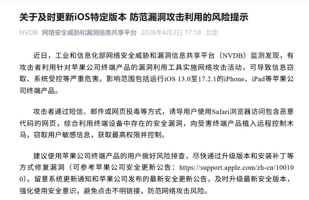 据网络安全威胁和漏洞信息共享平台消息,近日,工业和信息化部网络安全威胁和漏洞信息共享平台(NVDB)监测发现,有攻击者利用针对苹果公司终端产品的漏洞利用工具实施网络攻击活动,可导致信息窃取、系统受控等严重危害。影响范围包括运行iOS 13.0至17.2.1的iPhone、iPad等苹果公司终端产品。