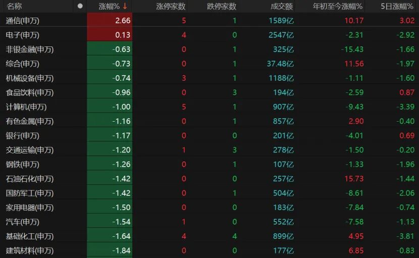 31个申万一级行业中,通信板块高开高走,德科立“20cm”涨停,汇源通信、世嘉科技、中瓷电子、通宇通讯涨停。电子板块也微红,中船特气、易天股份“20cm”涨停,腾景科技、美迪凯、光莆股份、江丰电子涨幅均超10%,亚世光电、福晶科技涨停。
