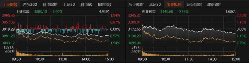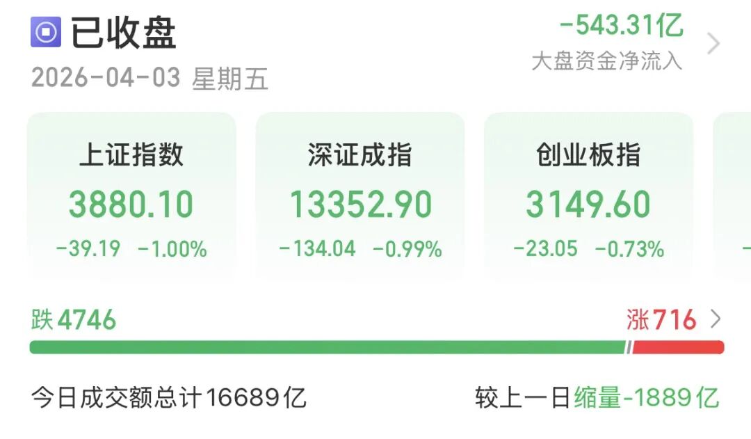 清明节前最后两个交易日,A股持续走低。今日在假期避险情绪主导下,市场缩量下跌,全天表现低迷。指数方面,沪指收跌1%报3880.1点,创业板指收跌0.73%报3149.6点,深证成指收跌0.99%。沪深300、上证50跌幅均不超1%,科创50微跌,北证50跌逾2%。