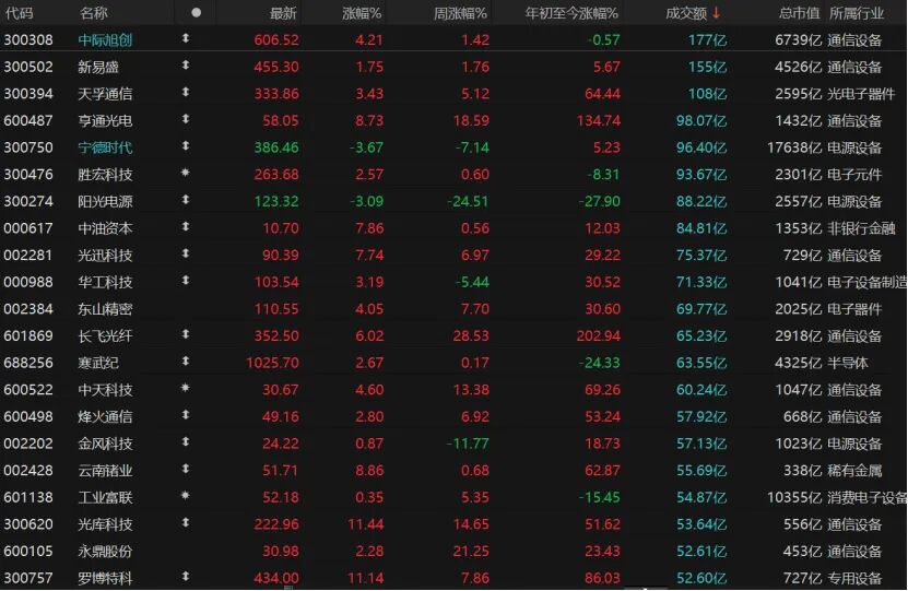 市场亏钱效应明显,全天共计4746只个股收跌,跌停股41只;仅有716只个股收红,涨停股38只。今日CPO概念龙头股“易中天”(中际旭创、新易盛、天孚通信)三只股票日成交额均超100亿元,且悉数收涨。电源设备个股宁德时代、阳光电源跌幅均超过3%。