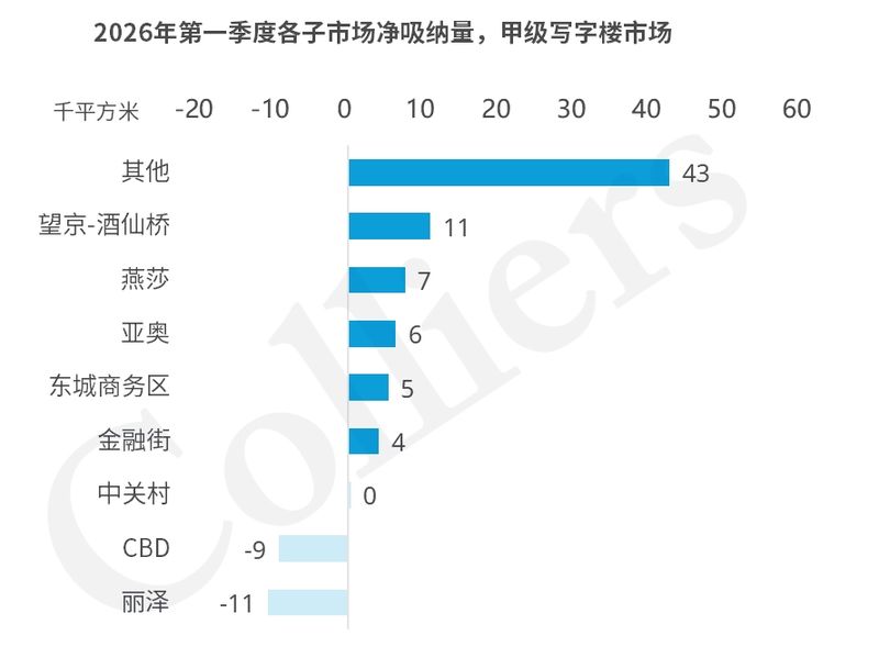 子市场之间的表现分化明显。非核心区域的甲级项目成为需求承接的主力,贡献了近4.3万平方米的净吸纳量,占整体的75%。其中,CBD子市场净吸纳量仍为负值,空置面积连续三年增加;丽泽子市场则首次录得净吸纳量负值。高力国际指出,丽泽过去五年年均净吸纳量高达15.2万平方米,空置率从66%大幅回落至21.2%,本轮调整为良性回调。