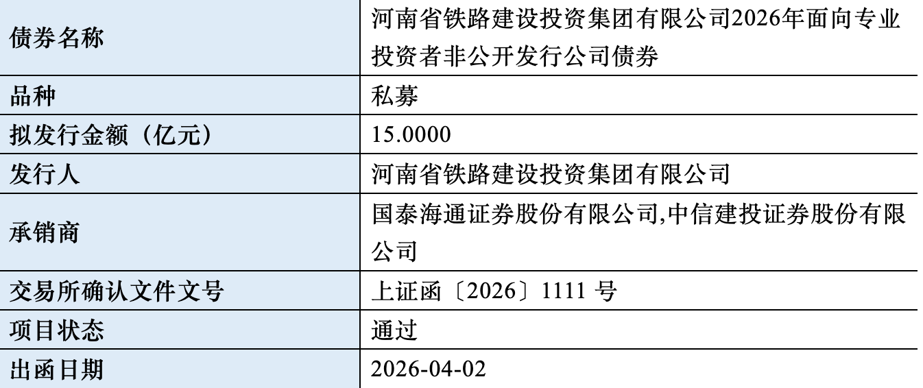 【大河财立方消息】4月2日,河南省铁路建设投资集团有限公司2026年面向专业投资者非公开发行公司债券项目获上交所通过。该债券拟发行金额15亿元,承销商/管理人为国泰海通证券。2025年7月25日,经中诚信国际综合评定,发行人主体信用评级为AAA,评级展望稳定。