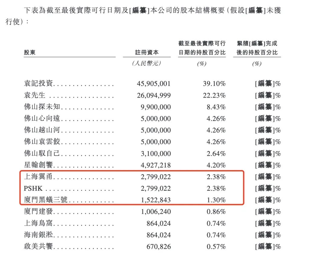 截至招股书最后实际可行日期,PSHK、上海翼甬、厦门黑蚁三号合共持有袁记食品6.06%股权。