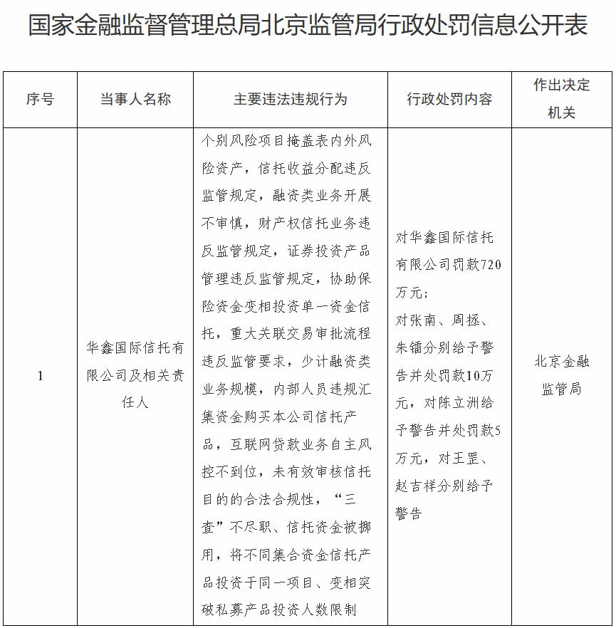 华鑫信托被罚720万元