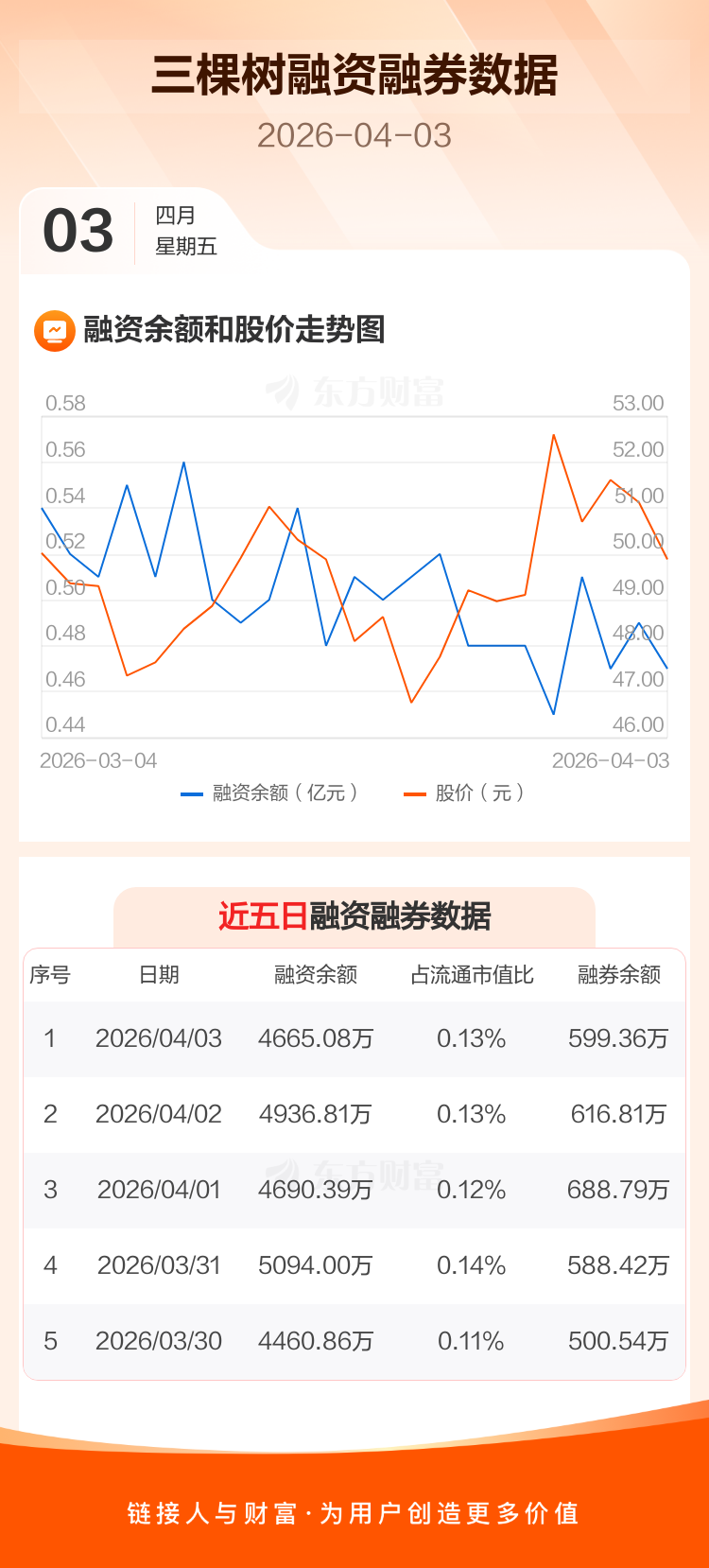 交易所最新数据显示,三棵树于2026年4月3日获融资买入416.17万元,融资偿还687.89万元,当日融资净偿还271.72万元。目前,该股融资余额4665.08万,占流通市值比例为0.13%。