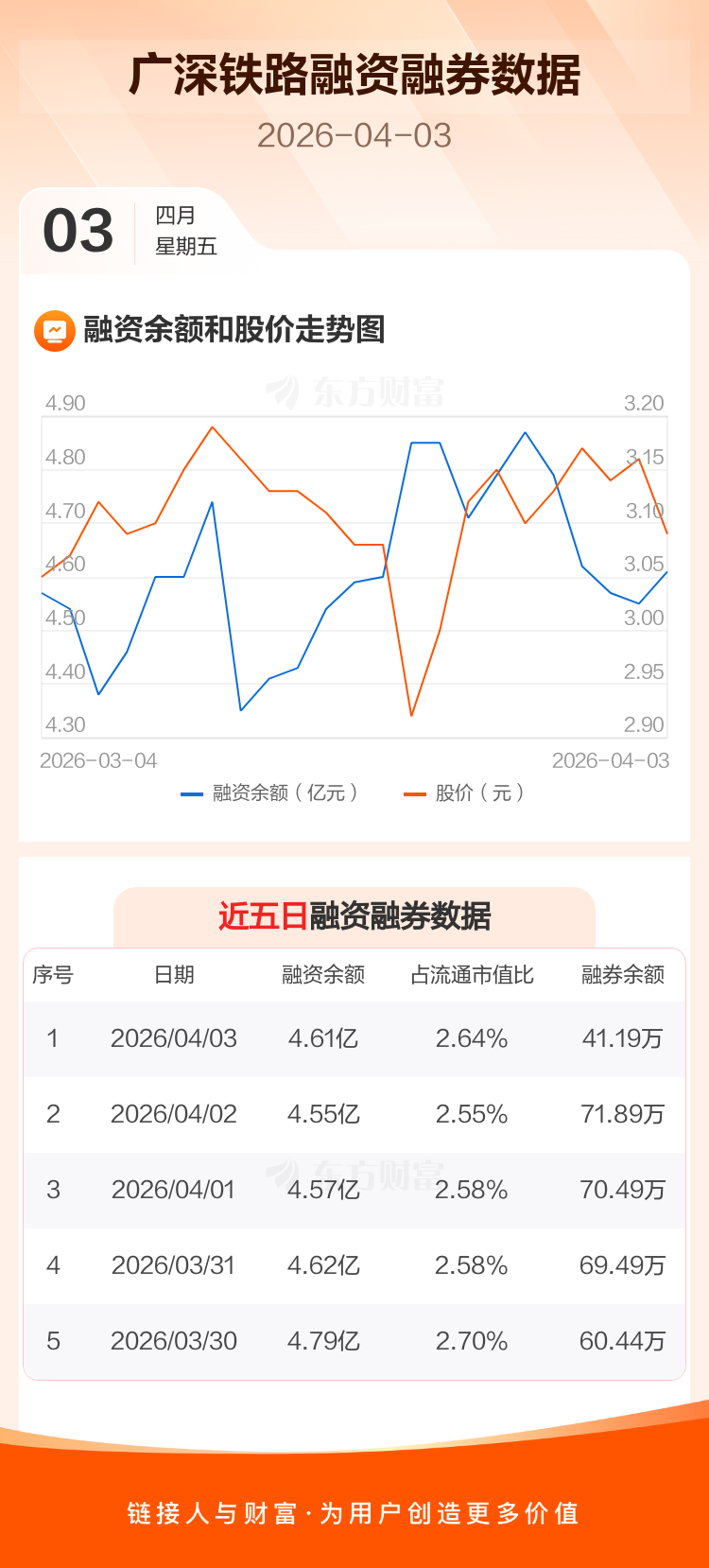 交易所最新数据显示,广深铁路于2026年4月3日获融资买入2416.48万元,融资偿还1759.78万元,当日融资净买入656.7万元。目前,该股融资余额4.61亿,占流通市值比例为2.64%。