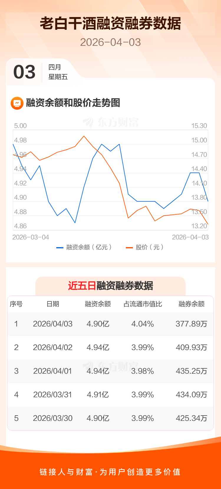 交易所最新数据显示,老白干酒于2026年4月3日获融资买入505.20万元,融资偿还900.44万元,当日融资净偿还395.24万元。目前,该股融资余额4.90亿,占流通市值比例为4.04%。