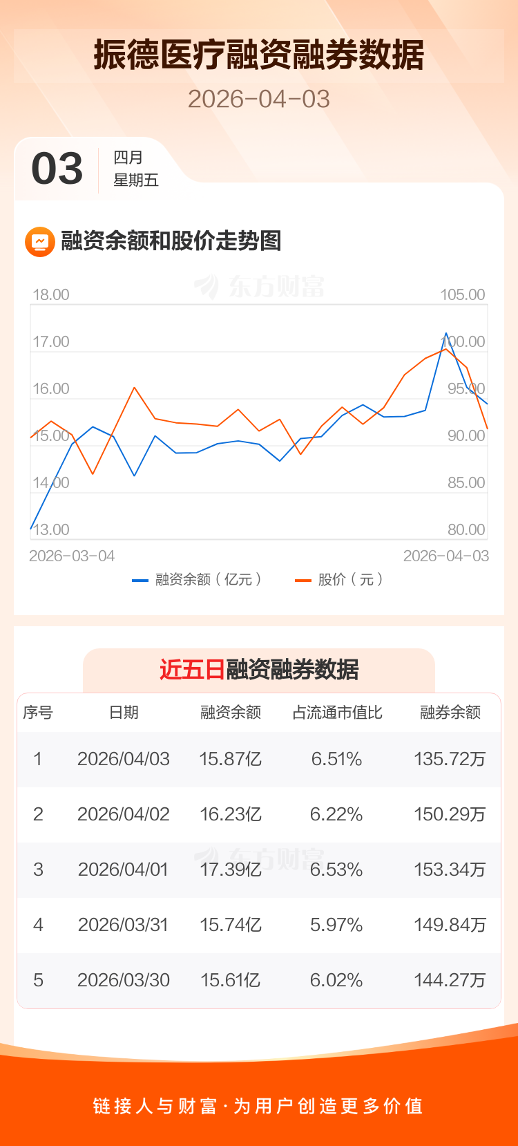 交易所最新数据显示,振德医疗于2026年4月3日获融资买入1.38亿元,融资偿还1.74亿元,当日融资净偿还3644.6万元。目前,该股融资余额15.87亿,占流通市值比例为6.51%。