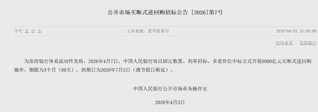 据中国人民银行官网消息,为保持银行体系流动性充裕,2026年4月7日,中国人民银行将以固定数量、利率招标、多重价位中标方式开展8000亿元买断式逆回购操作,期限为3个月(89天),到期日为2026年7月5日(遇节假日顺延)。