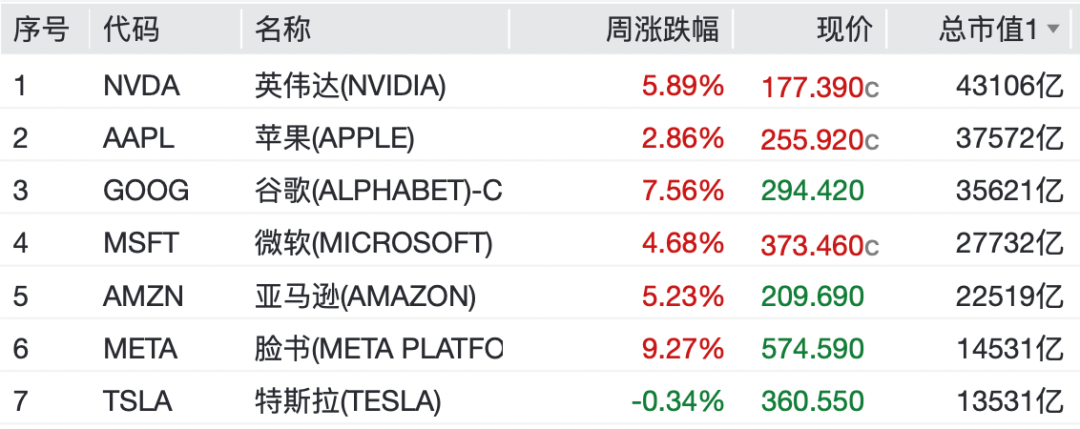 美国科技七巨头指数本周表现亮眼。Meta大涨9%,谷歌涨超7%,英伟达涨超5%,微软涨超4%、苹果涨超2%。