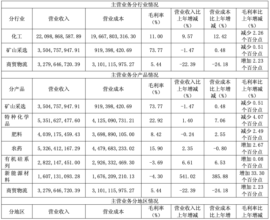 分行业来看,报告期内,化工行业实现营业收入22,098,868,587.89元,较上年同比增长9.57%,毛利率减少2.26个百分点至11.00%;矿山采选行业营业收入3,504,757,947.91元,同比减少1.47%,毛利率减少0.51个百分点至73.77%;商贸物流营业收入3,279,646,720.39元,同比减少22.39%,毛利率增加2.23个百分点至5.44%。