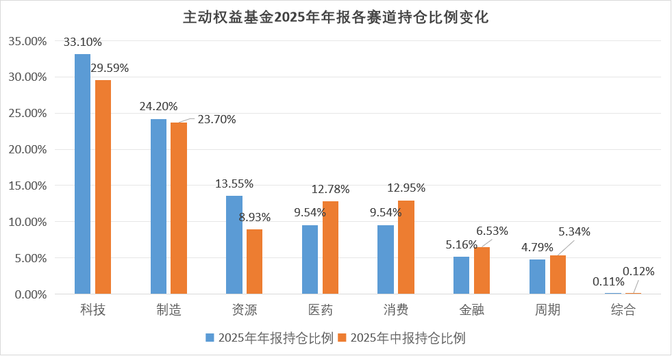 从配置行业方向看,科技赛道的长期发展逻辑未变。2025年末主动权益基金将科技板块的持仓从年中的29.59%提升至33.10%;制造板块紧随其后,持仓从年中的23.70%提升至年末的24.20%;资源板块提升幅度最明显,由年中的8.93%大幅提升至年末的13.55%。