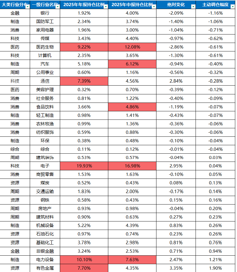 值得注意的是,有色金属和通信行业获主动权益基金明显加仓,截至2025年末持仓比例分别达7.70%、7.39%,新晋第四、第五大重仓行业,成为配置新亮点;而汽车行业、食品饮料行业则遭减持,剔除前五重仓行业之列。