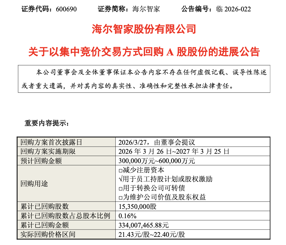 消费领域龙头公司同样积极跟进回购行动。海尔智家近期披露回购计划,拟回购30亿元至60亿元公司股票用于员工持股计划。在方案发布后,公司迅速实施,首笔回购即完成约765万股股份的回购,金额约1.68亿元;自首次回购至3月底,公司累计回购1535万股,回购金额达3.34亿元。
