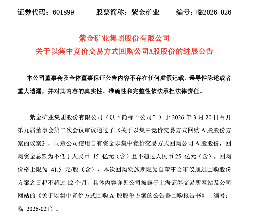 以紫金矿业为例,公司在董事会审议通过回购方案后迅速落地执行。3月以来,公司已累计回购股份约5303.01万股,占总股本0.20%,支付金额达16.82亿元;此前公司在3月23日即实施首次回购,当日回购金额达6.42亿元,体现出高效执行力与坚定回购意愿。