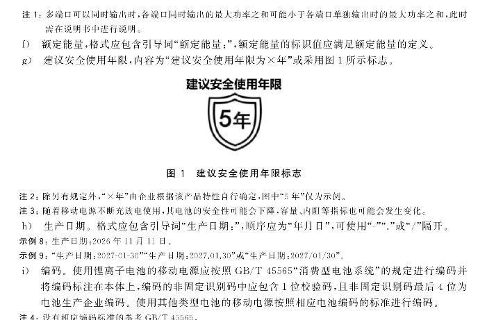 为方便消费者查询移动电源电池品牌等核心信息,《技术规范》不但推行产品唯一性编码管理,要求移动电源标注专属“身份证号码”,也要求移动电源上标注建议安全使用年限,提醒消费者关注老旧产品安全,及时更换新的移动电源;为从根源上提升移动电源的安全水平,《技术规范》还明确要求加强对原材料、生产过程进行全流程管控。
