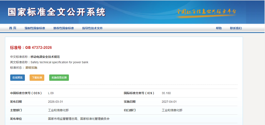 将于2027年4月1日实施的强制性国家标准《移动电源安全技术规范》(GB47372—2026)近日正式发布。业内人士认为,市场或将迎来新一轮“质量洗牌”潮,符合新国标的充电宝价格或将有一定程度上涨。