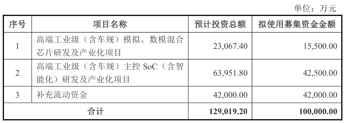 据公告,扣除发行费用后将用于高端工业级(含车规)模拟、数模混合芯片研发及产业化项目、高端工业级(含车规)主控SoC(含智能化)研发及产业化项目及补充流动资金。