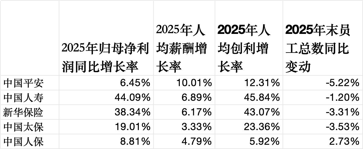 在此背景下,中国太保、中国人寿、中国人保、中国平安、新华保险2025年的人均创利分别增长23.36%、45.84%、5.92%、12.31%、43.07%。