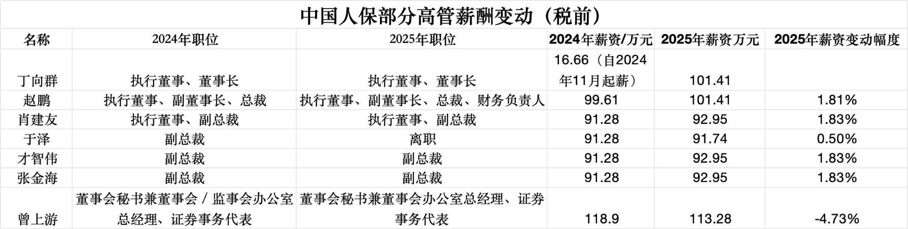 中国人保方面,管理层年度薪酬总额下降19.92%,但从部分高管2024年-2025年薪酬来看变动不大。