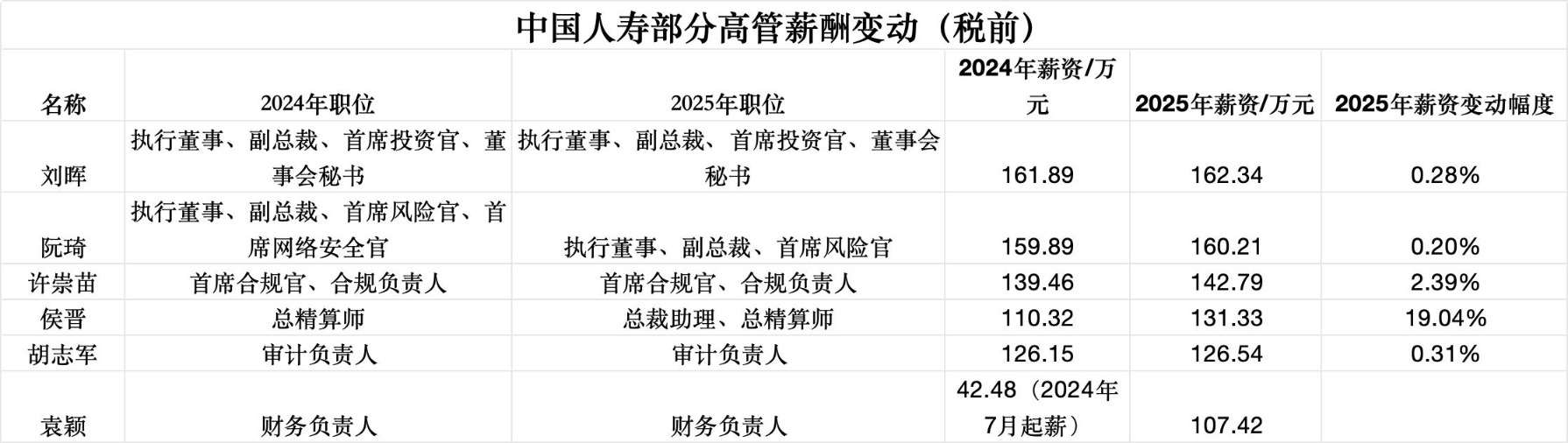具体来看,中国人寿管理层年度薪酬总额下降32.74%。其中,总精算师侯晋在2025年兼任总裁助理一职,薪资增长近20%。