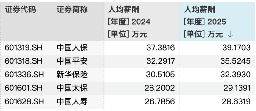 从绝对额来看,中国人保人均薪酬保持领先。根据Wind数据,中国人保2025年人均薪酬为39.17万元,其次为中国平安35.52万元,中国人寿人均薪酬最低,为28.63万元。