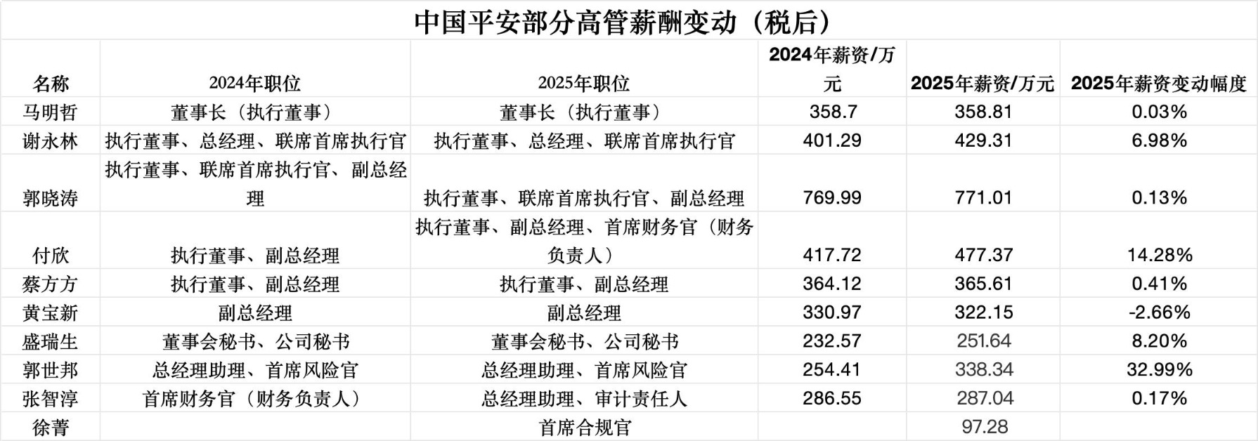 此外,中国平安总经理助理、首席风险官郭世邦2025年税后薪资上涨近33%;执行董事、副总经理付欣在2025年兼任首席财务官(财务负责人)一职,税后薪资增逾14%。