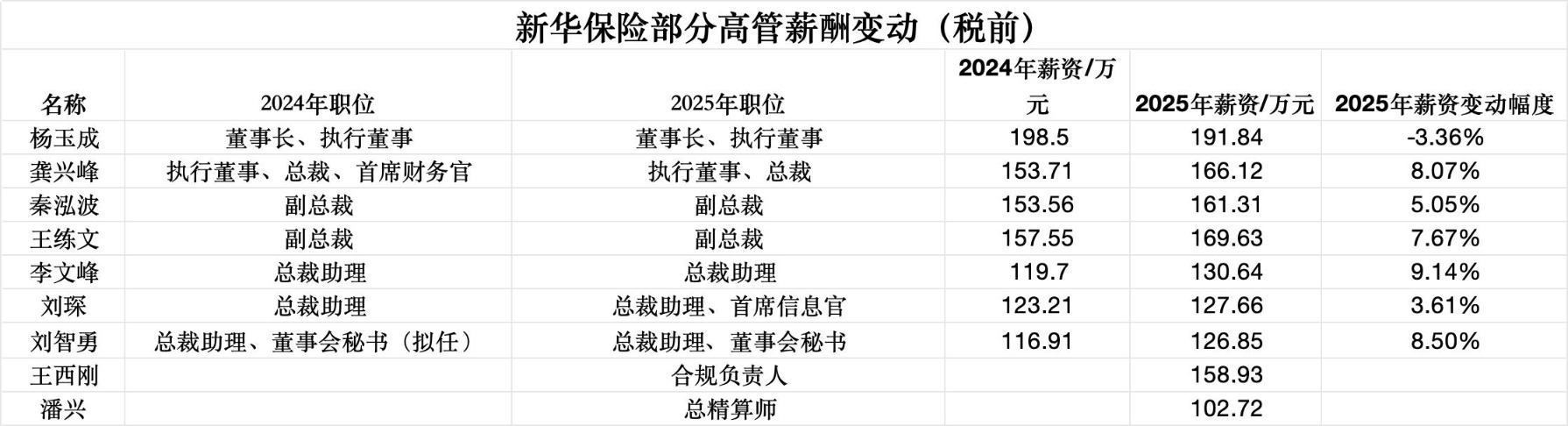 新华保险管理层年度薪酬总额增长9.11%,董事长、执行董事杨玉成2025年税前薪酬微降3.36%,副总裁、总裁助理等多位高管2025年薪酬实现个位数增幅。
