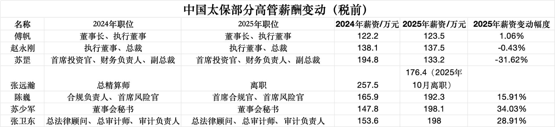 2025年,中国太保管理层年度薪酬总额同比增长5.89%。其中,副总裁、首席投资官、财务负责人苏罡2025年税前收入同比减少超三成;而董秘苏少军2025年税前总薪资增长34.03%,总法律顾问、总审计师、审计负责人张卫东增长近三成。
