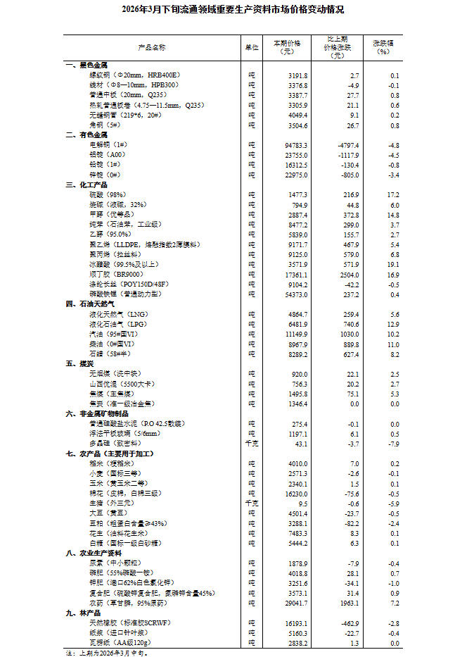 中新网4月4日电据国家统计局网站消息,据对全国流通领域9大类50种重要生产资料市场价格的监测显示,2026年3月下旬与3月中旬相比,31种产品价格上涨,16种下降,3种持平。