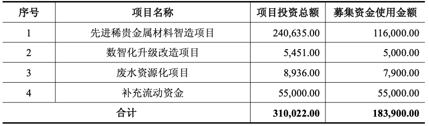 其中,先进稀贵金属材料智造项目投资总额240,635.00万元,拟投入募集资金116,000.00 万元。 数智化升级改造项目投资总额5451.00万元,拟投入募集资金5000.00万元。废水资源化项目投资总额8936.00万元,拟投入募集资金7900.00万元。公司拟使用55,000.00万元募集资金补充流动资金,以满足公司业务和规模的持续增长所带来的营运资金需求。