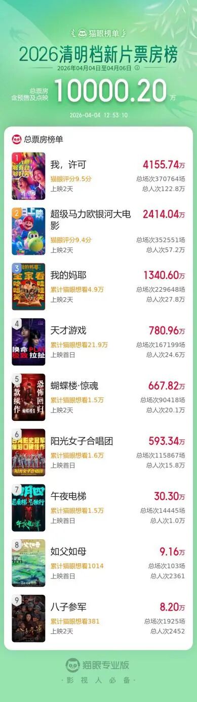 据猫眼专业版数据,截至4月4日12时53分,2026年清明档新片总票房已突破亿元,《我,许可》《超级马力欧银河大电影》《我的妈耶》暂列清明档新片票房榜前三位。