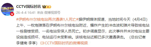 据伊朗媒体报道,当地时间今天(4月4日)上午,一枚炮弹落在伊朗布什尔核电站附近,爆炸产生的冲击波和弹片导致核电站一栋侧楼受损,一名电站安保人员死亡。