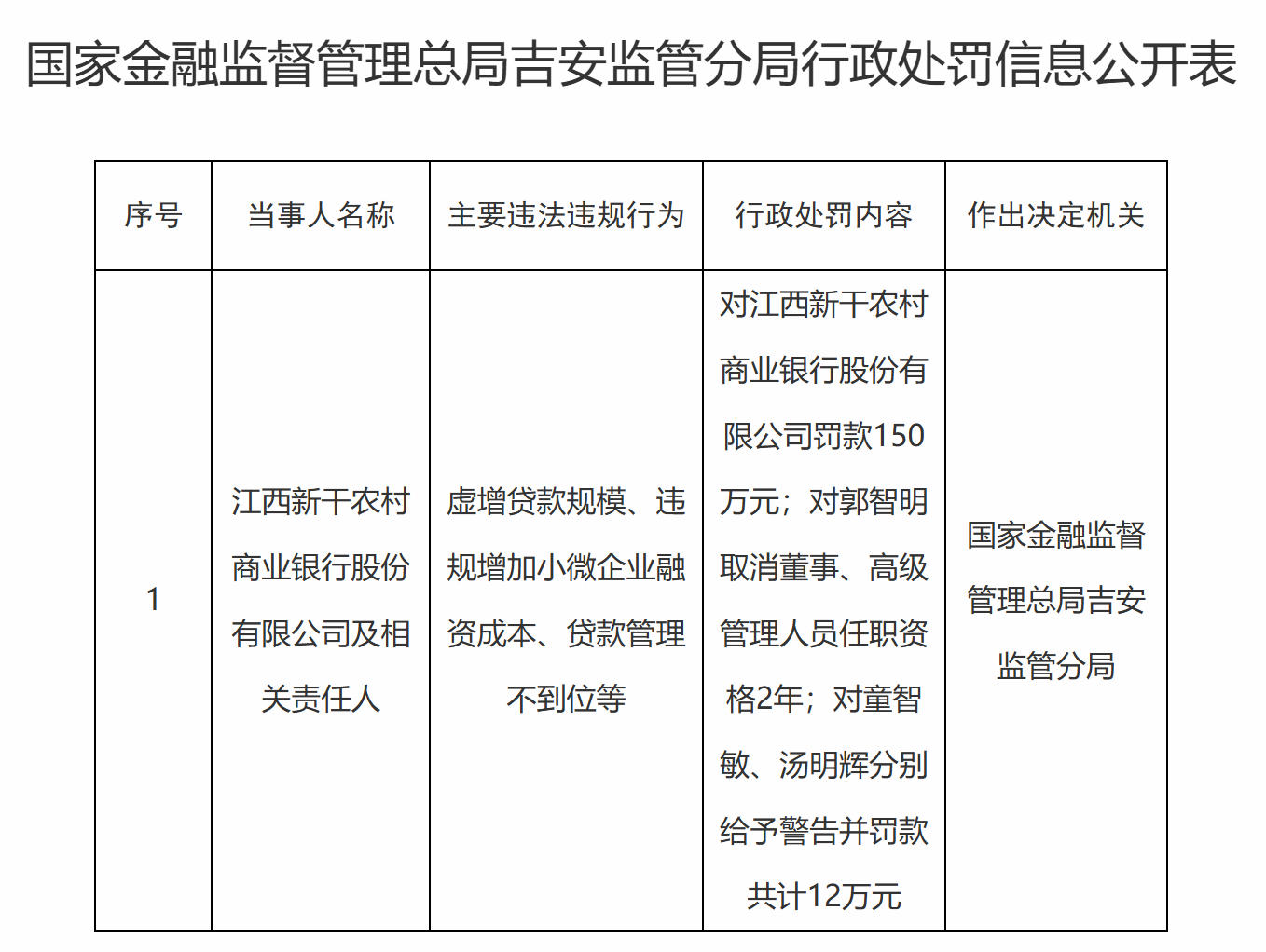 4月3日,据国家金融监督管理总局吉安监管分局行政处罚信息公开表显示,江西新干农村商业银行股份有限公司因虚增贷款规模、违规增加小微企业融资成本、贷款管理不到位等违法违规行为,被罚款150万元。同时,对该公司郭智明取消董事、高级管理人员任职资格2年;对童智敏、汤明辉分别给予警告并罚款共计12万元。