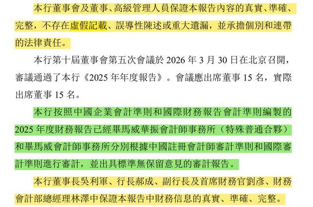 光大银行在H股年报中亦表示,“本行董事会及董事、高级管理人员保证本报告内容的真实、准确、完整,不存在虚假记载、误导性陈述或重大遗漏,并承担个别和连带的法律责任。”同时提及,“本行董事长吴利军、行长郝成、副行长及首席财务官刘彦、财务会计部总经理林泽中保证本报告中财务信息的真实、准确、完整。”