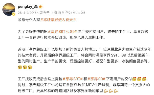 4月3日,华为智选车产品总监(享界系列)彭磊在微博发文透露,享界超级工厂技术升级改造进入尾期工作,工厂技改完成后会马上提拉享界S9T和享界S9下定用户的交付。同时,享界超级工厂也将迎来全新SUV和MPV生产试制。