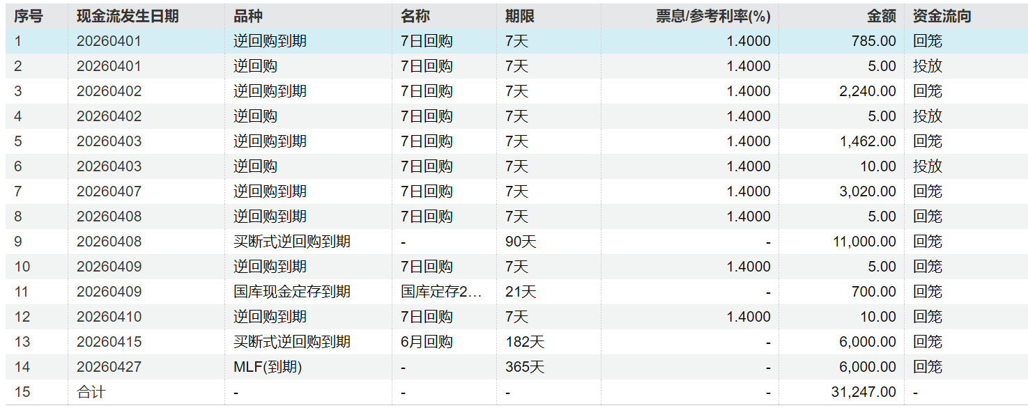 4月3日,央行公告,为保持银行体系流动性充裕,2026年4月7日,中国人民银行将以固定数量、利率招标、多重价位中标方式开展8000亿元买断式逆回购操作,期限为3个月(89天),到期日为2026年7月5日(遇节假日顺延)。