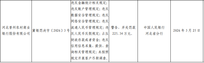 4月3日,中国人民银行河北省分行公布的行政处罚决定信息公示表显示,河北晋州农村商业银行股份有限公司因多项违法行为被警告,并处罚款225.34万元。