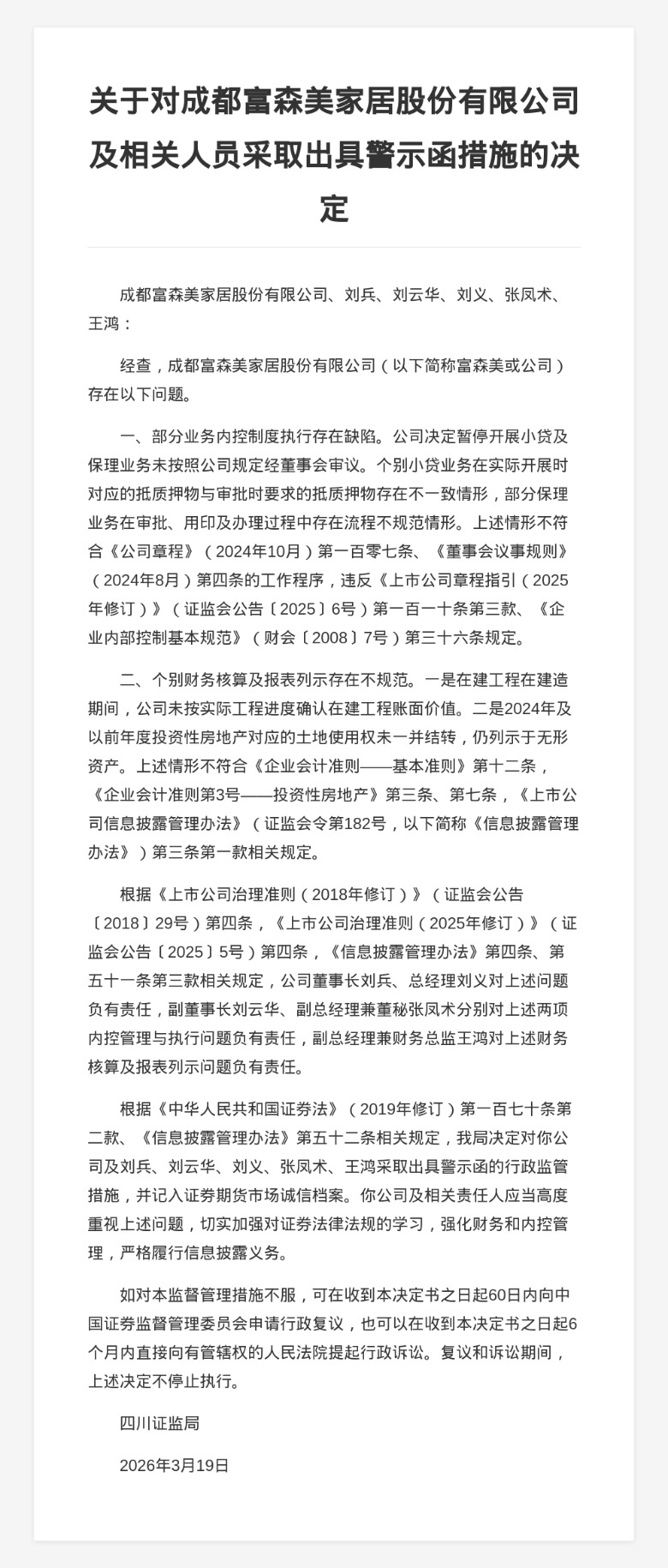 成都富森美家居被出具警示函,涉内控制度执行缺陷等