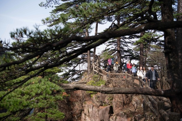 4月4日,游客在安徽省黄山风景区观光游览。清明小长假,人们走出家门,踏青游玩。 新华社记者张端摄