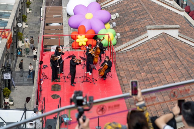 4月4日,俄罗斯莫斯科国立柴可夫斯基音乐学院独奏家室内乐团在百年弄堂屋顶演奏。4月4日,第41届“上海之春”文艺轻骑兵惠民行虹口专场首场演出在“滨港商业中心今潮8弄”启幕。俄罗斯莫斯科国立柴可夫斯基音乐学院独奏家室内乐团来到百年弄堂屋顶演奏,为市民呈现沉浸式艺术盛宴。 新华社记者王翔摄