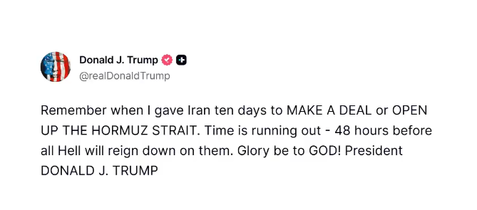 特朗普称:“还记得我曾给伊朗10天的期限,要么达成协议,要么开放霍尔木兹海峡吗?时间所剩无几——距离一切灾难降临在他们头上仅剩48小时了。”