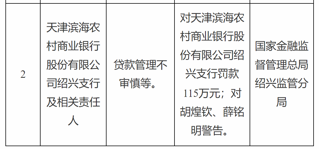贷款管理不审慎,天津滨海农商行绍兴支行领115万元罚单