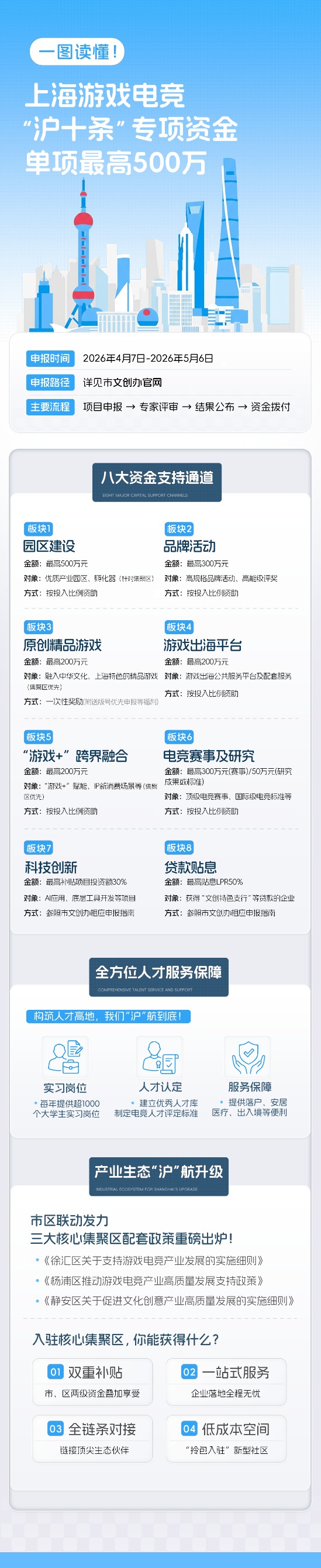 这是上海首次以专项政策形式,全方位推动游戏电竞产业高质量发展,助力“全球电竞之都”建设。记者注意到,此次推出的一系列扶持政策中,单项最高支持金额达到500万元。