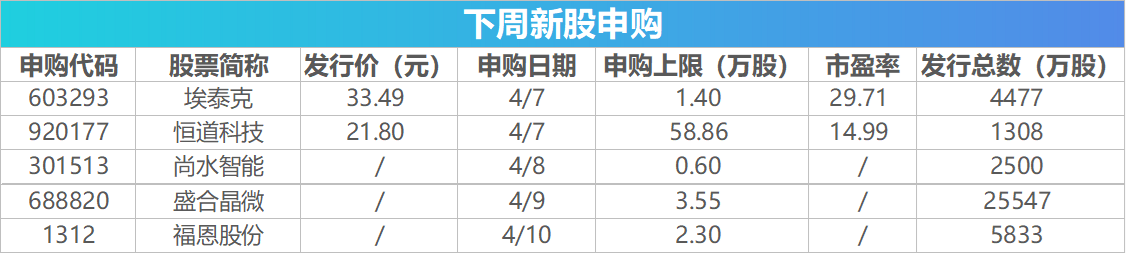 Wind数据显示,下周(4月6日至4月10日)将有5只新股发行,其中4月7日发行的是埃泰克、恒道科技;4月8日发行的是尚水智能;4月9日发行的是盛合晶微;4月10日发行的是福恩股份。