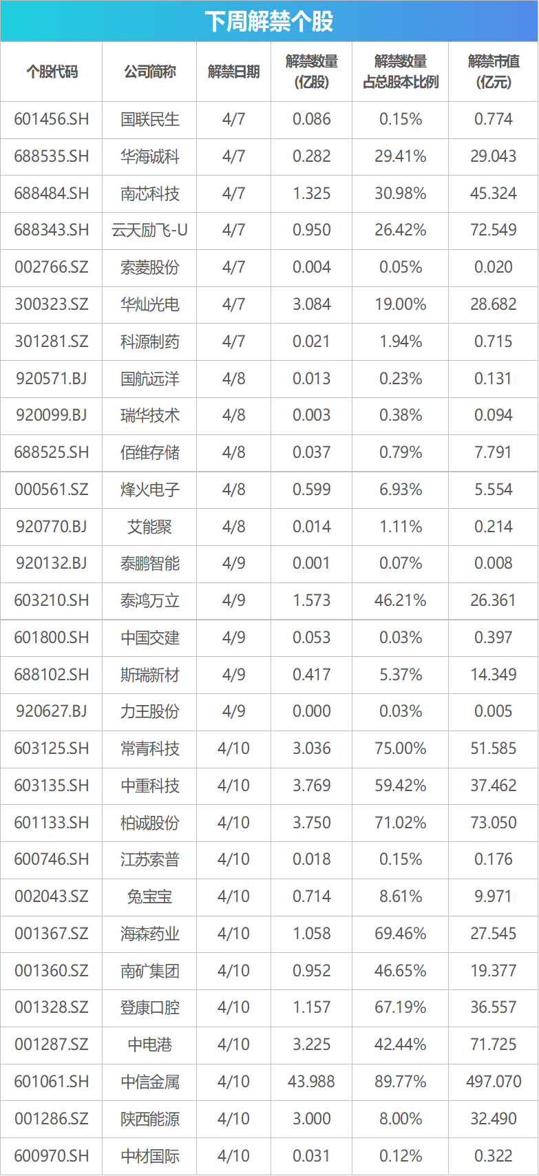 从解禁市值来看,解禁市值居前三位的是:中信金属(497.07亿元)、柏诚股份(73.05亿元)、云天励飞-U(72.53亿元)。从个股的解禁量看,解禁股数居前三位的是:中信金属(43.99亿股)、中重科技(3.77亿股)、柏诚股份(3.75亿股)。