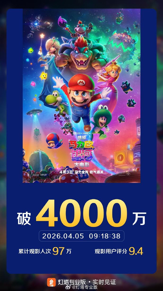 据灯塔专业版实时数据,截至4月5日9时18分,影片《超级马力欧银河大电影》票房突破4000万。